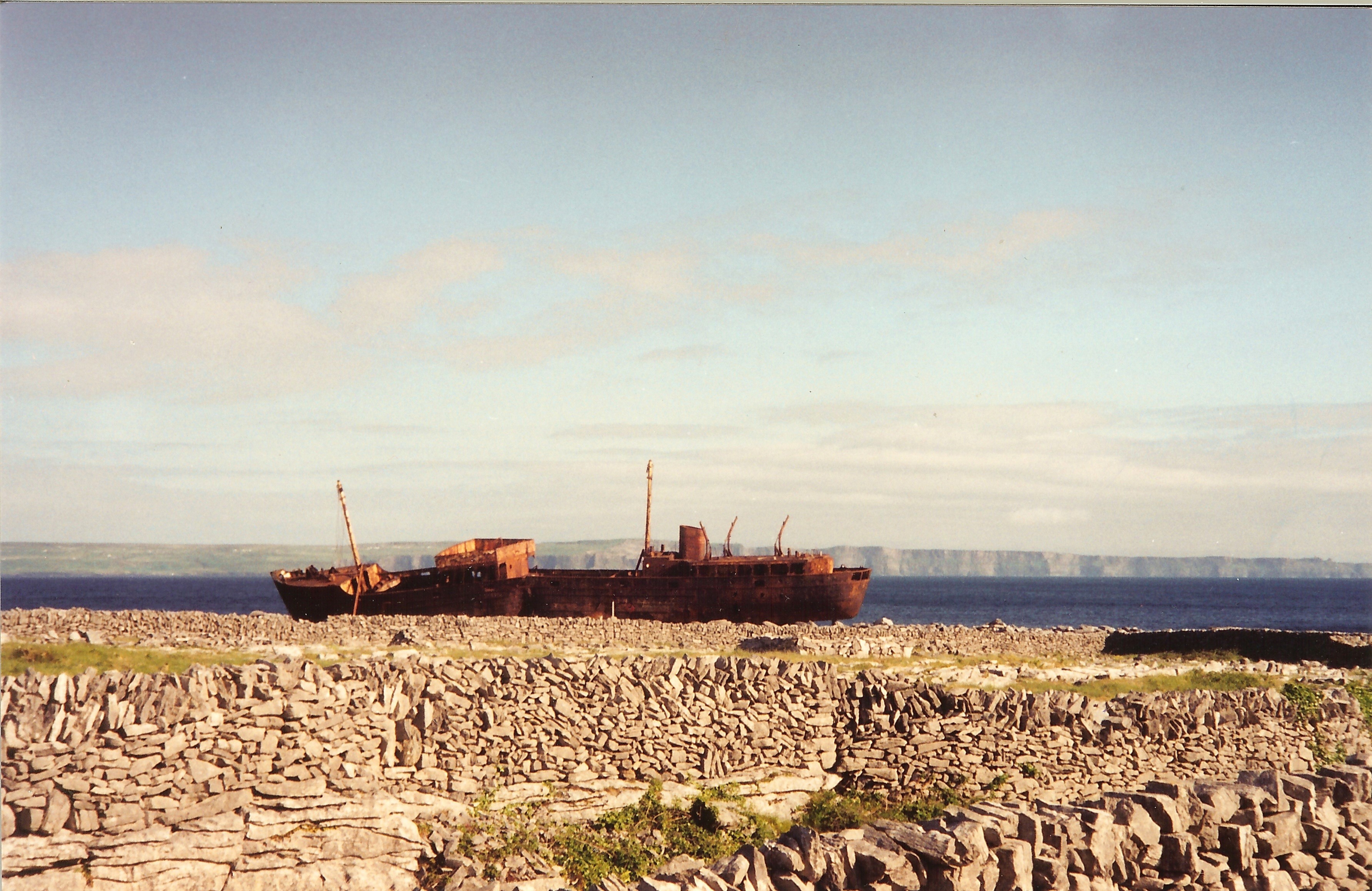 Tomas lets Angela console herself by taking over the steering again. We end up going for a trip around the whole island, only 4 square miles and nearly all limestone, just a big floating chunk of the stuff. The day brightens as we pass around the coast of the island where, across from the Cliffs of Moher, an old, hulking wrecked freighter rests—The Plassey, stuck there since a bad storm in 1960. We go on past a lighthouse and the uninhabited back of the island, where the sea has pounded and eaten away Inis Oirr’s limestone into large, step-like columns and slabs fit for a giant’s tread.