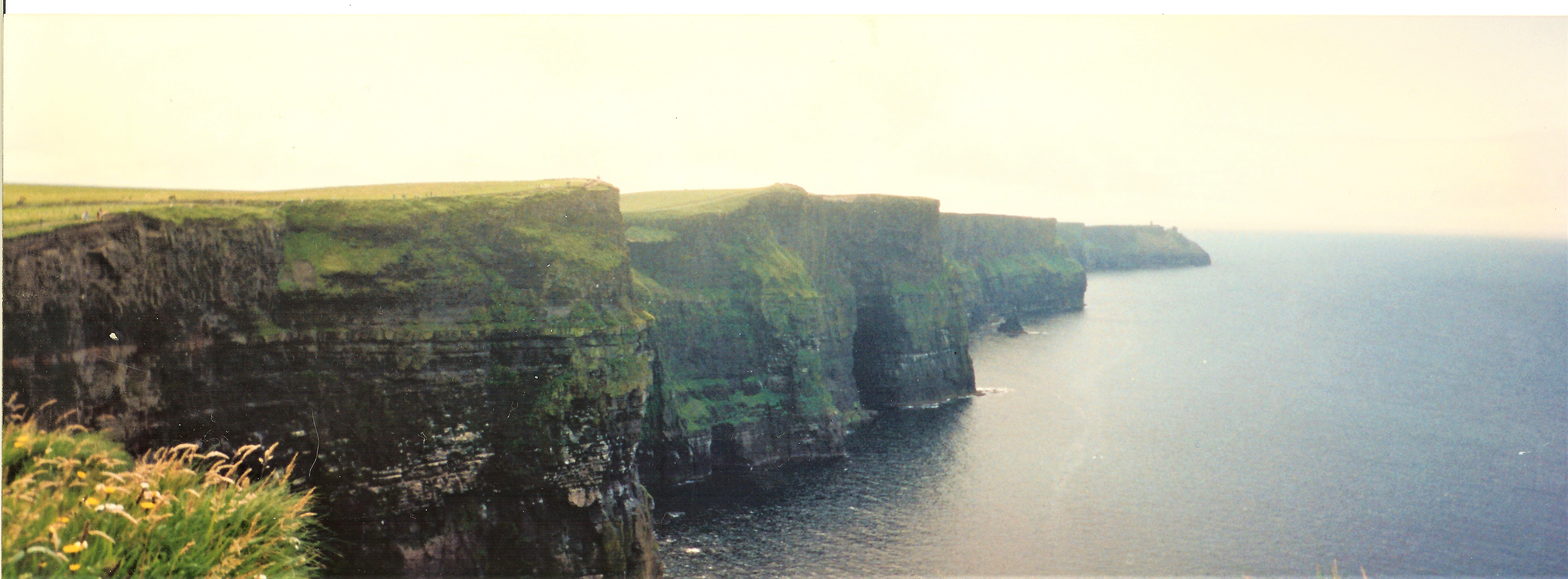 He’s steered the boat to places on the sea where the seagulls have been circling overhead and floating along with the waves. “Look for the birds. That’s where the fish are,” he tells us. Once he stops the motor, he takes up the oars and rows us out a little farther and then lets Angela and I have a go at the fish. We use a long line with a small weight at one end and several bait hooks. More than once I get excited when I think I feel a tug on the line, only to have Tomas take the line and tell me it’s got caught in the rocks underwater. Angela, meanwhile, becomes more interested in steering than fishing. Tomas restarts the motor and lets her guide us where the sea is deeper, where there’s less chance of our line getting caught up in rocks, and where we can see puffins bobbing on the water. There’s a large colony of them living amongst the cracks and crags of the mighty, moss-covered Cliffs of Moher, just a few miles from Inis Oirr on the mainland. Today is a classic Irish summer’s day—some sunshine, some clouds, some gray skies, some blue—but the wall of the cliffs is so massive that even the gray moments can’t dull the bright green of the cliffs. From the edge of Inis Oirr the cliffs look like a giant green flag, rippled by the wind.